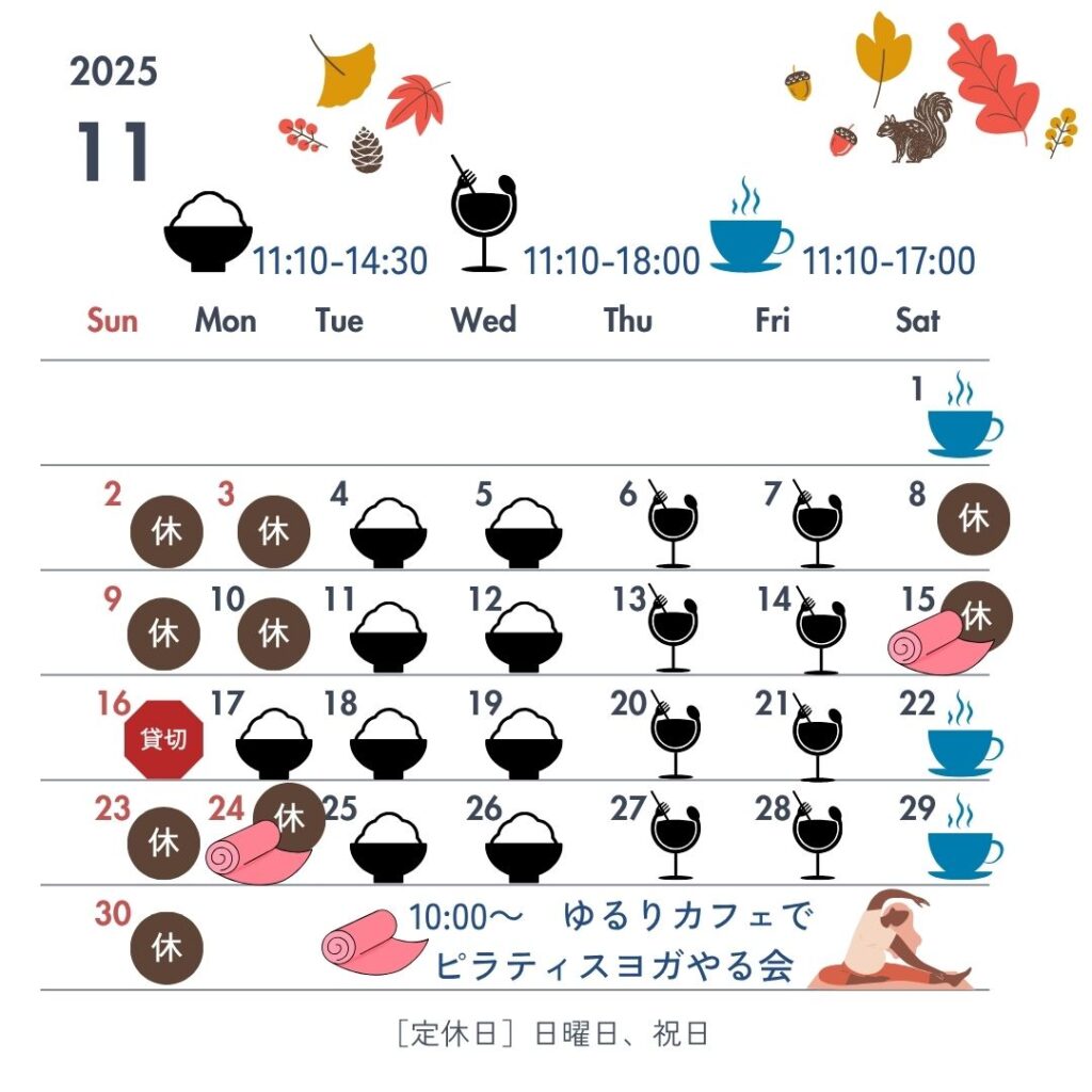 11月営業カレンダーBy cafe312 / 2025年10月29日 2024年4月より変更がございます・OPEN時間が早くなります 11:10~・CLOSED時間 (月)(火)(水)は14:30とします・ランチ ラストオーダー (月)(火)(水)は13:30とします
