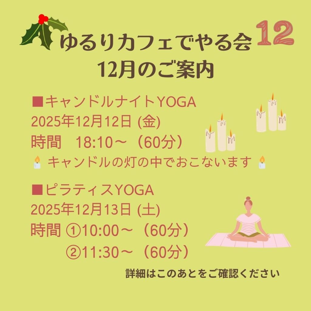 12月カフェヨガやる会By cafe312 / 2025年11月22日 講師は店主がつとめる、ゆるゆるとできる範囲で頑張ってみる会です 初心者向けのため本気度の高すぎる方はご遠慮ください……… カフェヨガ 定員/各6名様 12/12(土)ナイトキャンドルヨガ会 18:10~ 12/13(日)ピラティスヨガ会 ①10:00~ ②11:30~ オリジナルお正月飾り(予約制) 12/13(土)お正月飾り作る会 13:00-15:00 時間内であれば来店はご自由に上記日程は都合が合わないが、興味がある方はご相談ください ご予約はこちらから▶