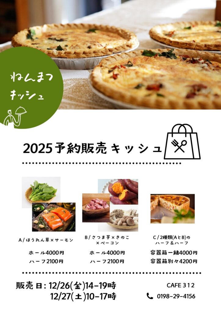 2025 ねんまつキッシュBy cafe312 / 2025年12月4日 毎年好評の年末キッシュ販売のお知らせキッシュは2種類、サイズはホールまたはハーフ2種類のハーフ&ハーフもございますふわっと柔らかく卵をしっかり感じられるキッシュです※大きさの目安※直径はホールケーキの8号相当(約直径24cm×高さ4cm) 作れる数量に上限がありますため、予約販売となります詳細はチラシをご確認ください 専用申込フォーム ねんまつキッシュ▶